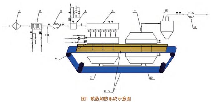 在進(jìn)風(fēng)風(fēng)機(jī)(3)的作用下,凈化的冷空氣(1)經(jīng) 過空氣-熱油加熱器(2)在混合室(4)中與蒸汽混合, 達(dá)到工藝要求的混合溫度和濕度后,混合氣體透過網(wǎng)帶 和帶孔壓板進(jìn)入板坯。為防止產(chǎn)生冷凝水,帶孔壓板采 用熱油盤管(6)進(jìn)行加熱。