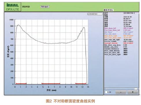 如圖2所示,斷面密度曲線(VDP)峰值左側(cè)920 kg/m3,右側(cè)880 kg/m3, 相差40 kg/m3;同時左側(cè)致密層厚約5~6 mm,而右側(cè)厚約3~4 mm,這在生 產(chǎn)12 mm中密度板時并不常見。因此在生產(chǎn)中將峰值高度、致密層厚度 明顯差異的斷面密度曲線稱為不對稱曲線。