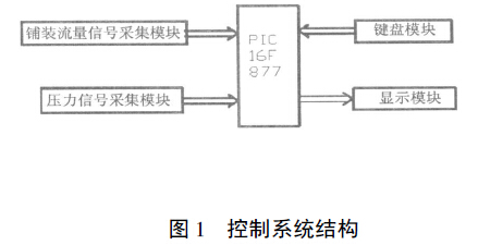 本系統(tǒng)在生產(chǎn)線上完成對密度板原料重量的檢測后,將其數(shù)據(jù)轉(zhuǎn)換成板材的密度值并顯示、回饋給鋪裝設(shè)備的操作人員,進行鋪裝厚度的調(diào)整,同時對調(diào)整的量進行記錄和顯示,以便于下次調(diào)整。整個控制系統(tǒng)分為鋪裝流量信號采集模塊、壓力信號采集模塊、鍵盤模塊和顯示模塊4個部分。