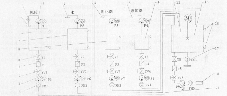 ①容積式調(diào)施膠(包括施蠟)計(jì)量系統(tǒng),以意大利IMAL公司制造的設(shè)備為代表,國內(nèi)生產(chǎn)中小型中密度密度板成套設(shè)備也多以此種批量式調(diào)施膠設(shè)備配套。容積式調(diào)施膠設(shè)備的膠料配制與TC/80計(jì)量系統(tǒng)主要由配膠機(jī)(上部有5個(gè)貯罐,分別為樹脂膠罐、水罐、固化劑罐、氨水罐、和備用罐,下部為一個(gè)膠料混合器)、輸出計(jì)量、泵組、控制與顯示以及各種貯罐、管道組成。