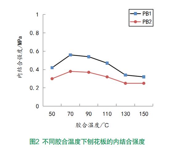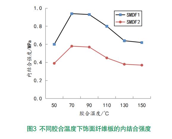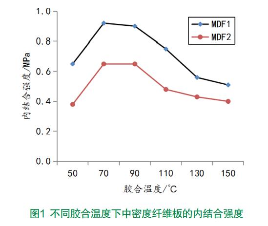 由圖1可知,中密度板內(nèi)結(jié)合強度隨著膠合溫度的升高呈現(xiàn)先升后降的趨勢,當(dāng)溫度為70℃時,不管是薄板(MDF1)還是厚板(MDF2)內(nèi)結(jié)合強度測試值均達(dá)到較大值,溫度升高至150℃,薄板的內(nèi)結(jié)合強度值降低了45%,厚板的內(nèi)結(jié)合強度值降低了38%。