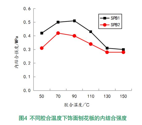 由圖3和圖4可知,飾面密度板與飾面刨花板內(nèi)結(jié)合強度測試結(jié)果隨膠合溫度升高的變化規(guī)律,與之前討論的中密度板和刨花板試樣的變化規(guī)律一致,隨著膠合溫度的升高,內(nèi)結(jié)合強度測試結(jié)果均先升高后降低,溫度升高至150℃時,飾面密度板薄板(SMDF1)的內(nèi)結(jié)合強度測試值降低了42%,飾面密度板厚板(SMDF2)降低了36%,飾面刨花板薄板(SPB1)降低了40%,飾面刨花板厚板(SPB2)降低了33%。對比發(fā)現(xiàn),不管是密度板還是刨花板,飾面處理后,內(nèi)結(jié)合強度的降幅都比素板內(nèi)結(jié)合強度測試結(jié)果的降幅低,這可能與飾面材料有一定的關(guān)系,飾面材料將基材與熱熔膠進(jìn)行了阻隔,降低了高溫對基材結(jié)構(gòu)的破壞。